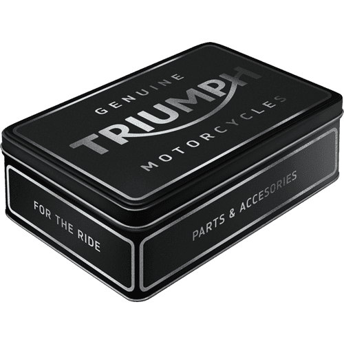 A premium vintage‑style Triumph Flat Tin, featuring a high‑quality matte print and an embossed retro design. This food‑safe 2.5L metal storage box includes a secure hinged lid, making it perfect for tools or everyday items.