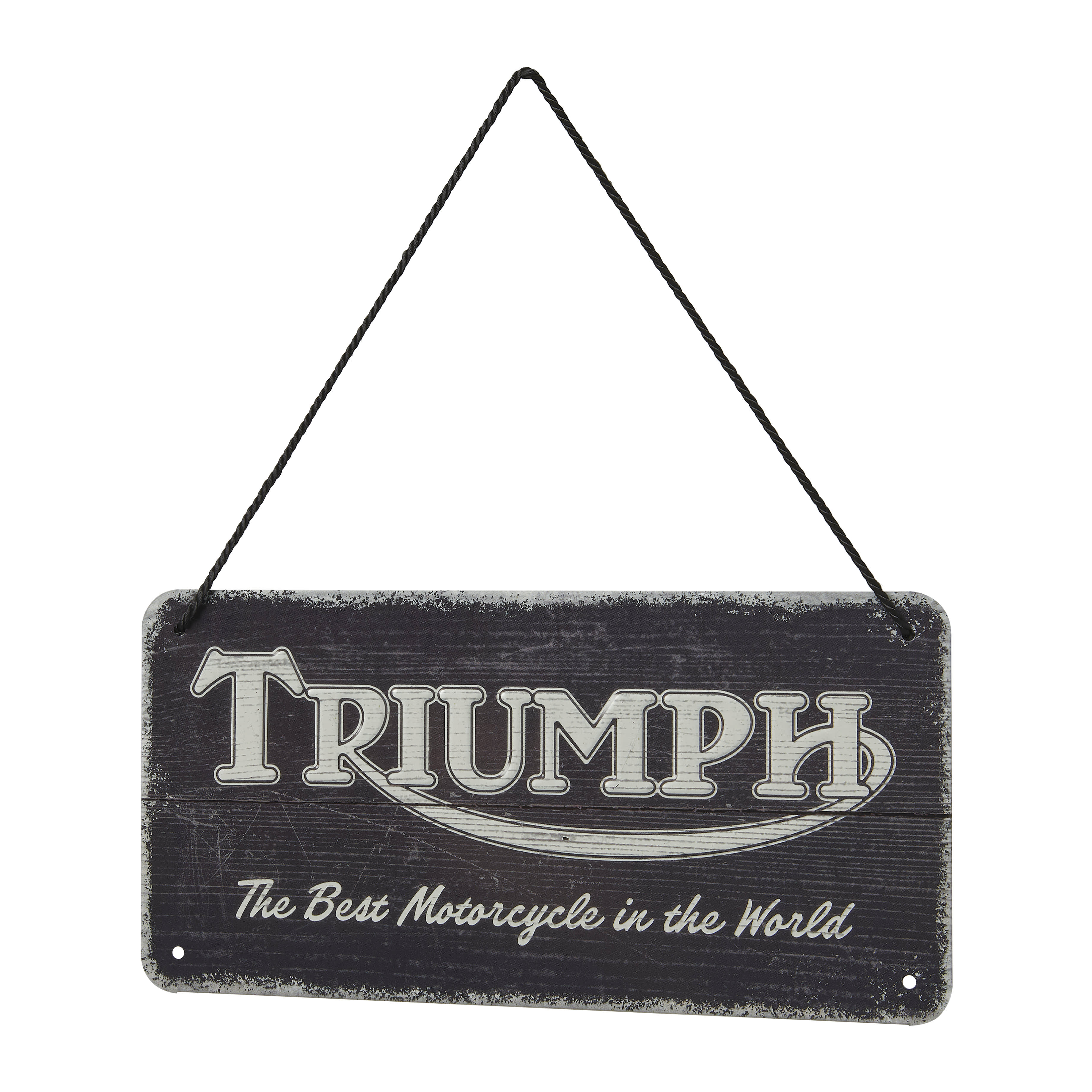 Add a rustic charm to any space with the Triumph Workshop Hanging Sign. A perfect addition to any rider's kitchen, office or workshop.Combining authenticity with practicality, the metal sign is crafted from durable 0.5mm sheet steel. Created using a 4-colour offset printing with a fine 70s grid. The result is a razor-sharp image and brilliant colours. The surface is sealed with a protective varnish, creating a wood effect finish.