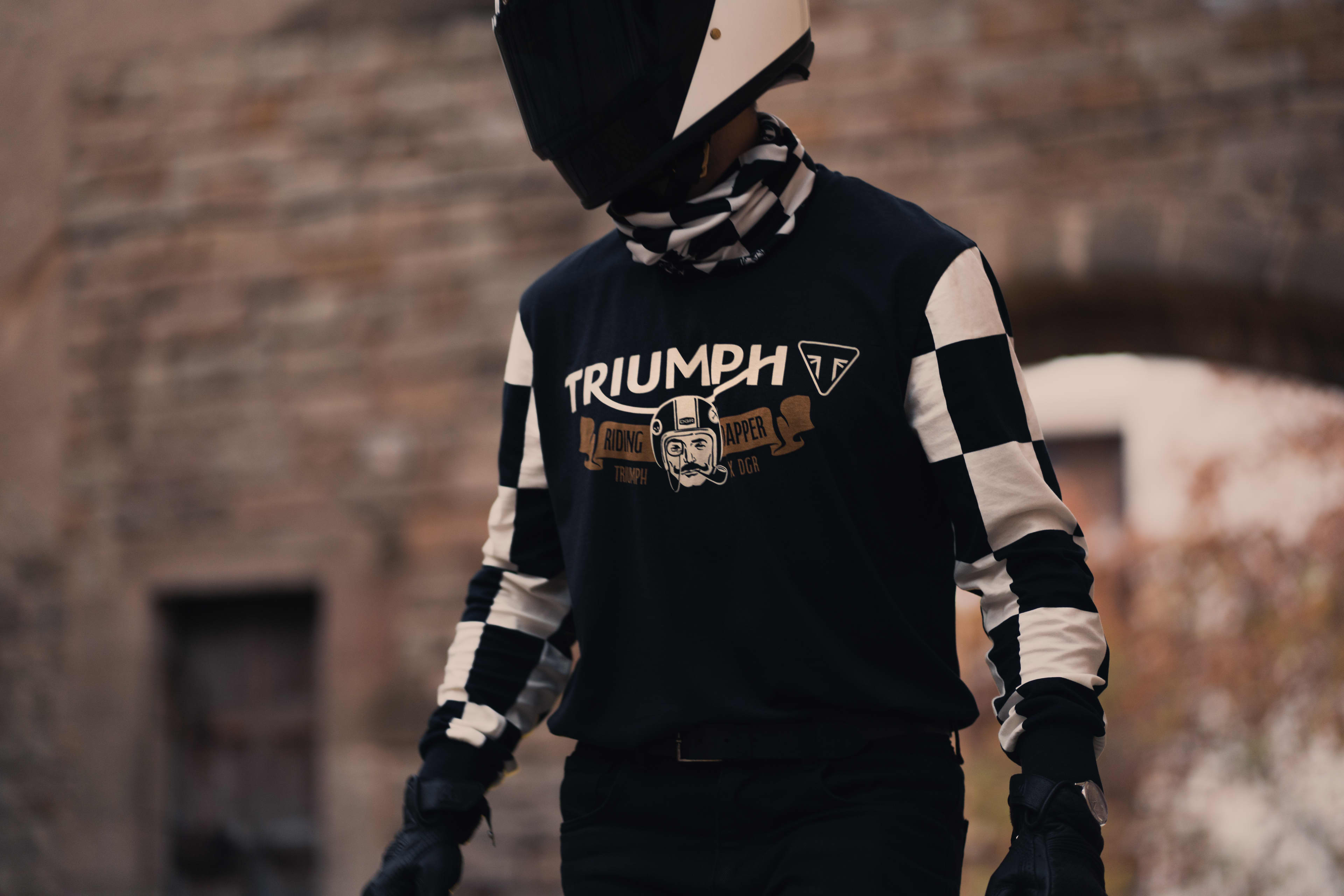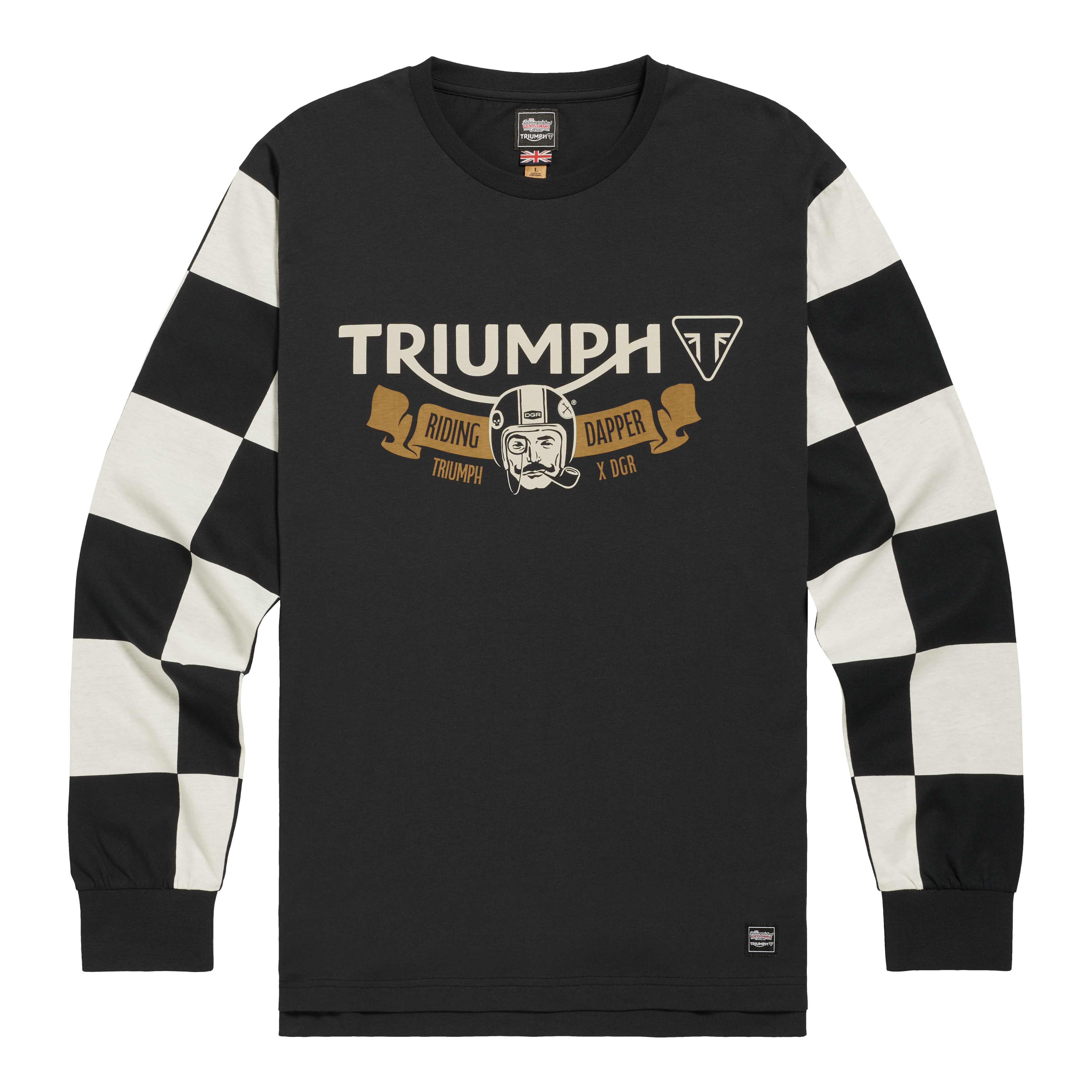 Drawing inspiration from our racing history and thrill of the finish line, this classic fit tee features bold checkerboard sleeves and original and exclusive co-branded Triumph and Distinguished Gentleman's Ride 2026 design.