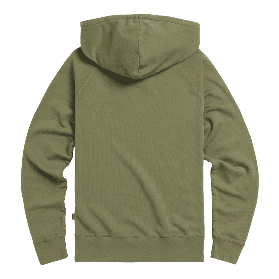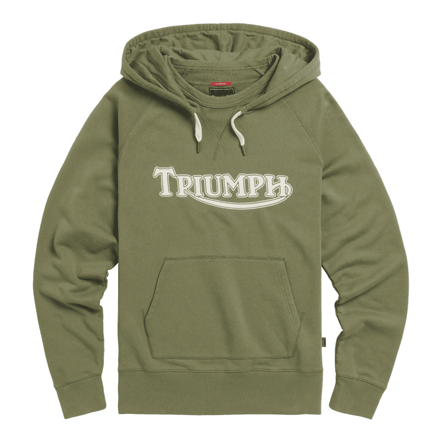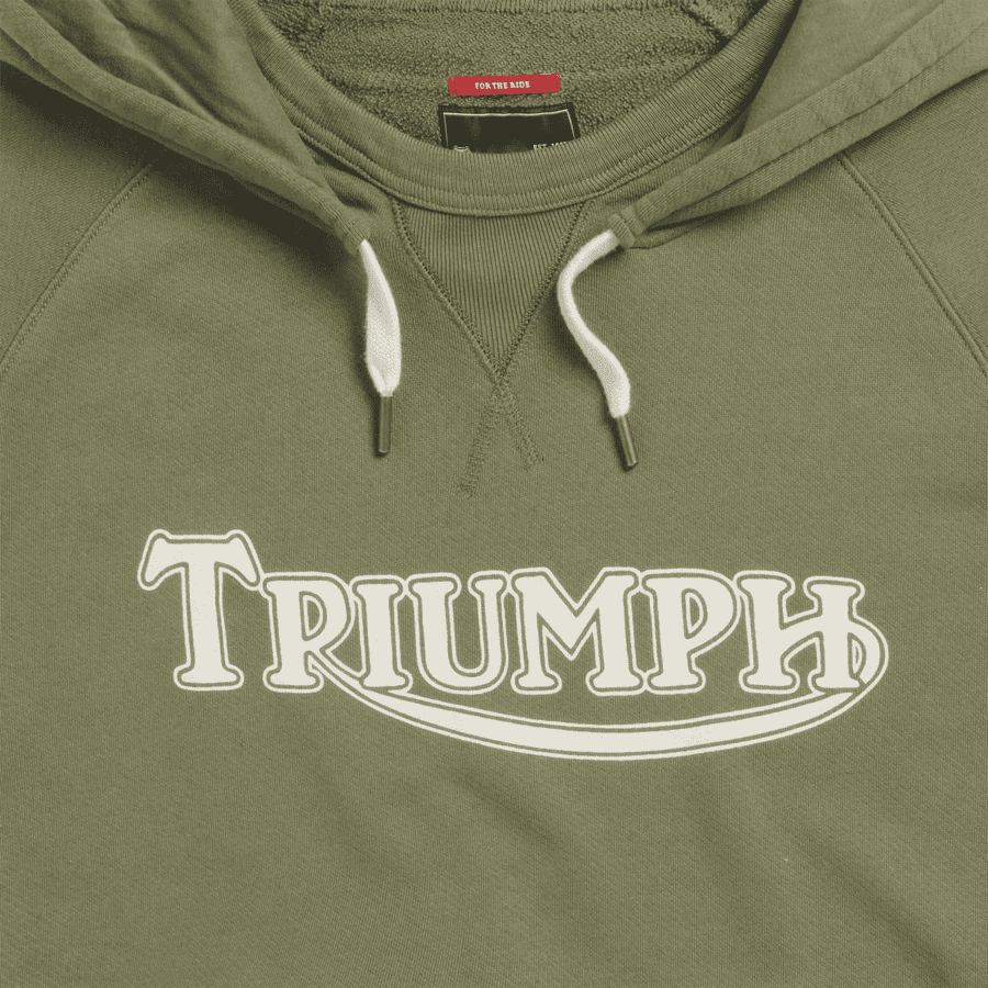 Classic fit heavyweight 400gsm cotton twill hoodie with military overlaid hoodie, kangaroo pocket, v-insert at neck and large Triumph Heritage Logo front and centre.