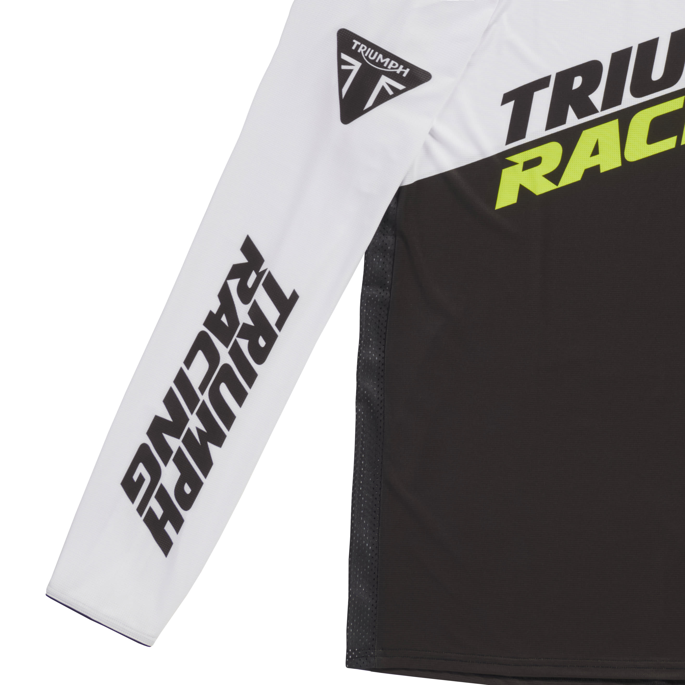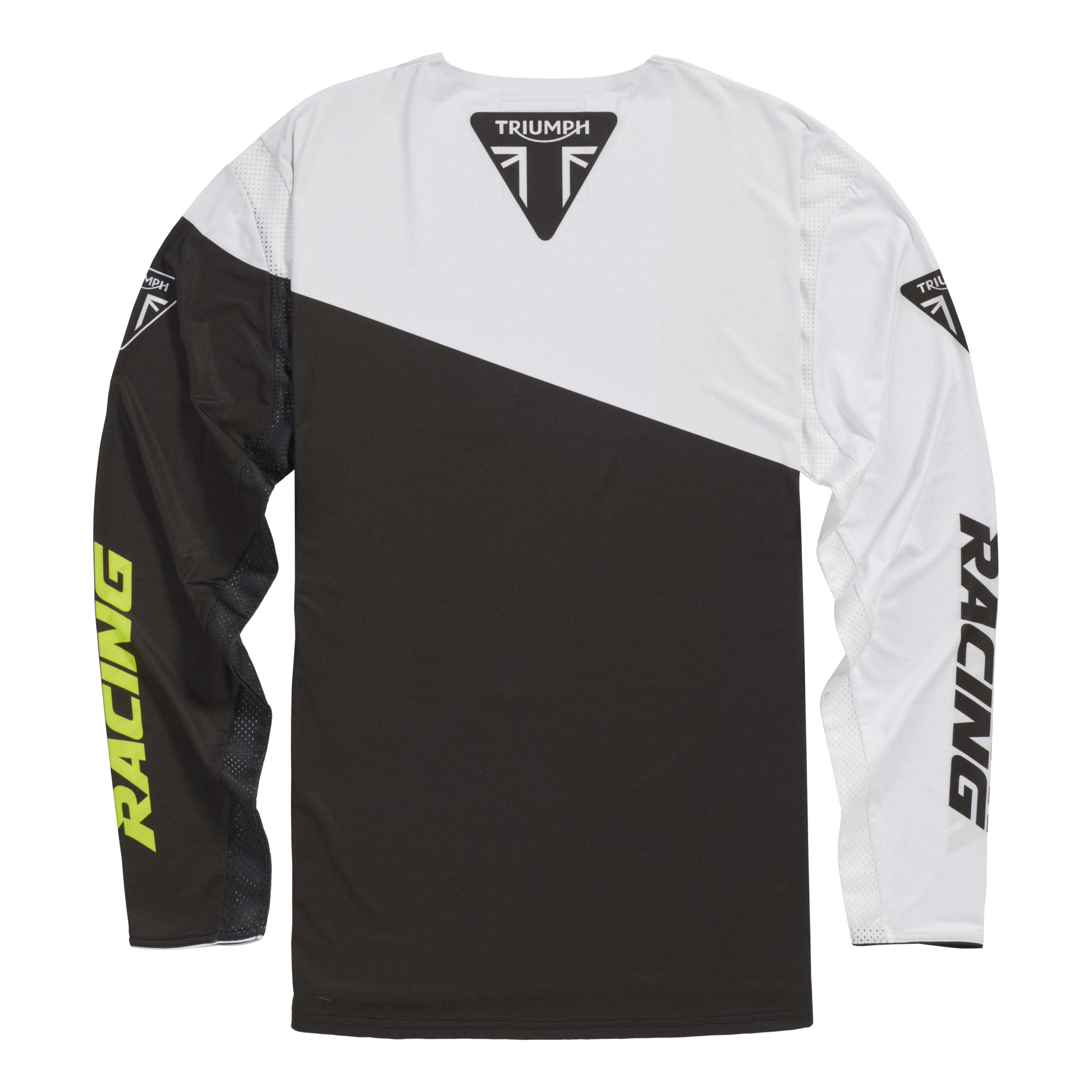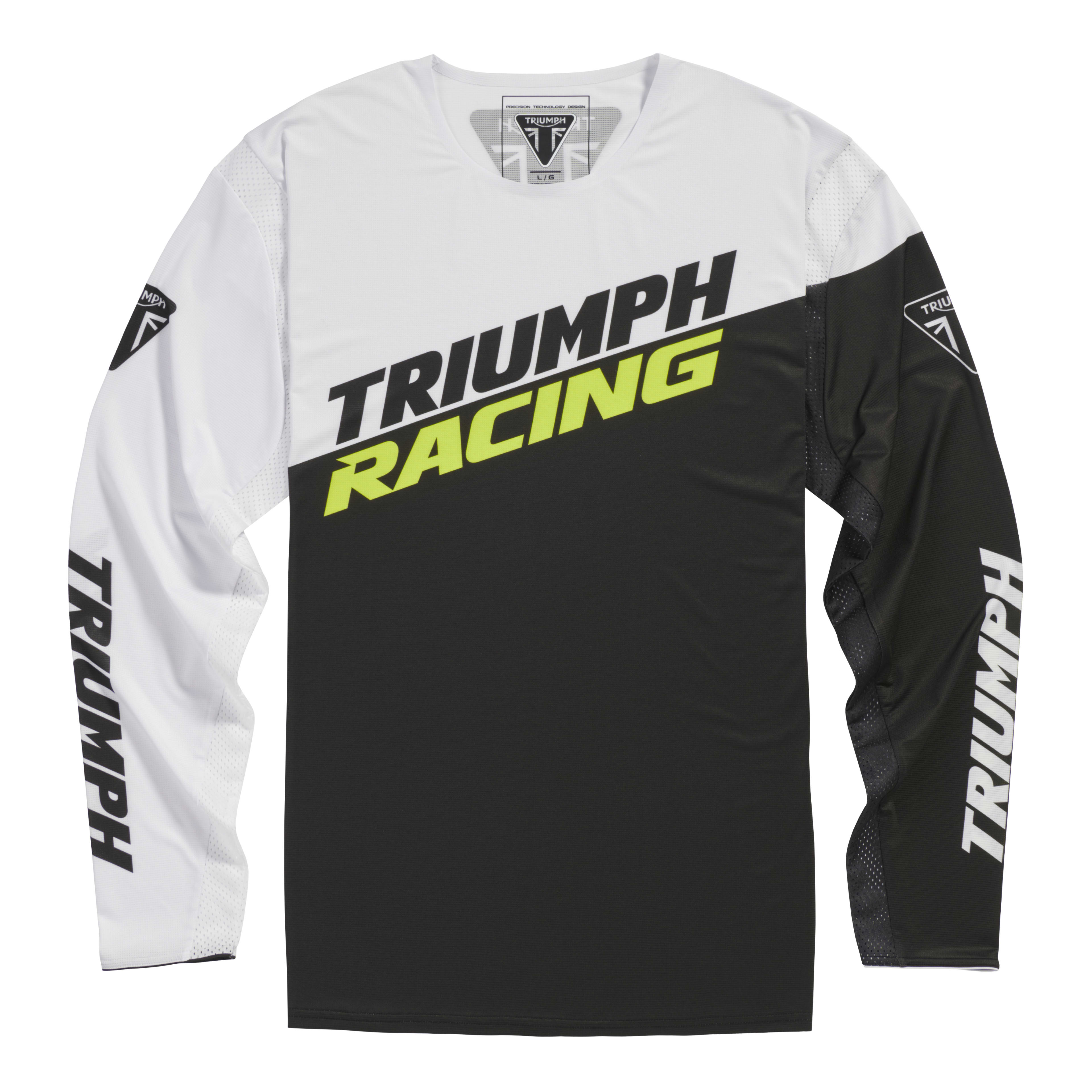 Our off-road jerseys are constructed from ultra-light advanced polyester stretch mesh, with shaped back panel for a secure and comfortable fit. Each jersey features bold Triumph Racing branding and the iconic fluorescent yellow, black and white colour scheme.