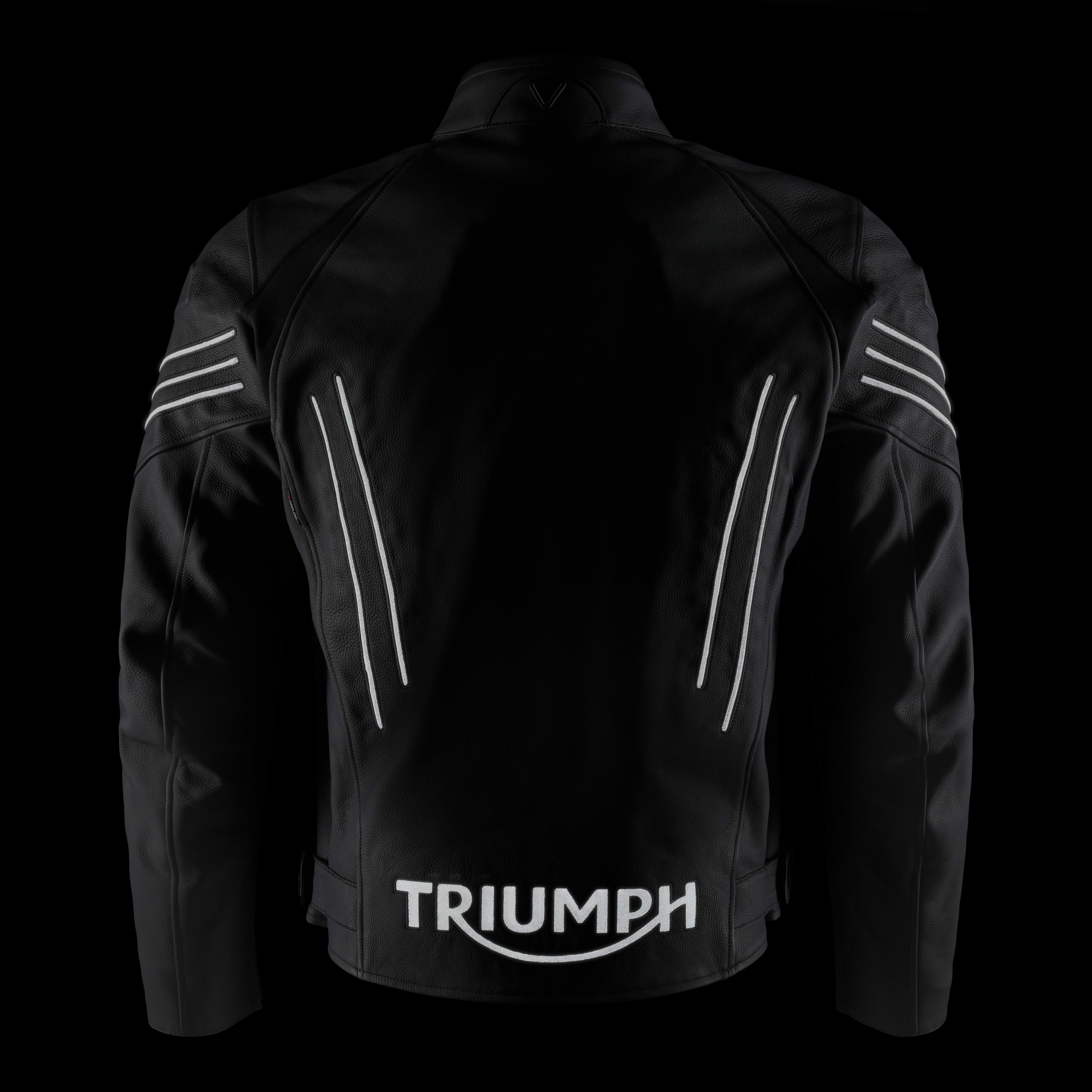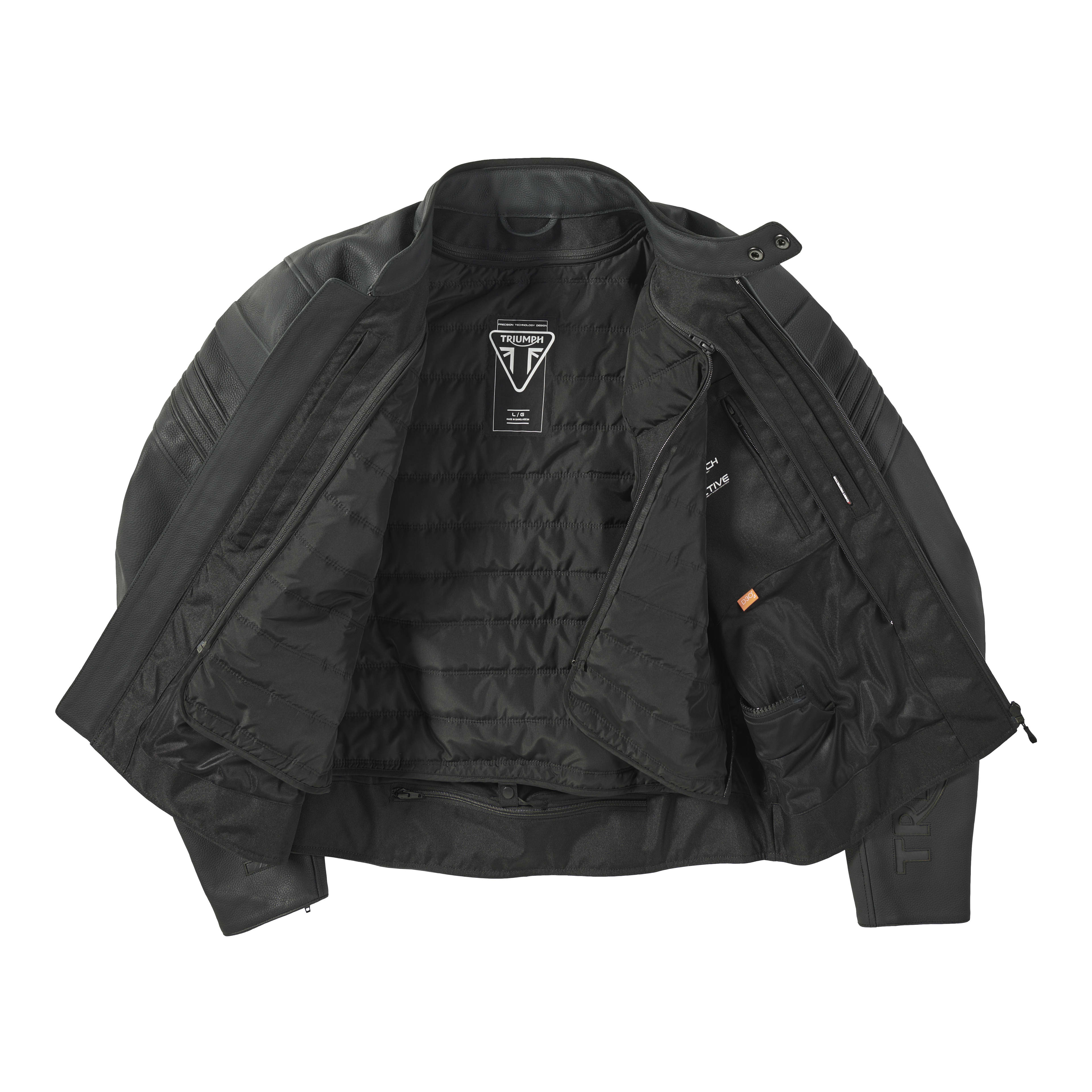 The Triumph Sabre Leather Jacket combines classic Roadster style with modern performance. Featuring a removable thermal liner and ergonomic stretch panels, it delivers comfort and versatility for all-season rides. Includes D3O® shoulder and elbow protectors with optional back and chest upgrades.
