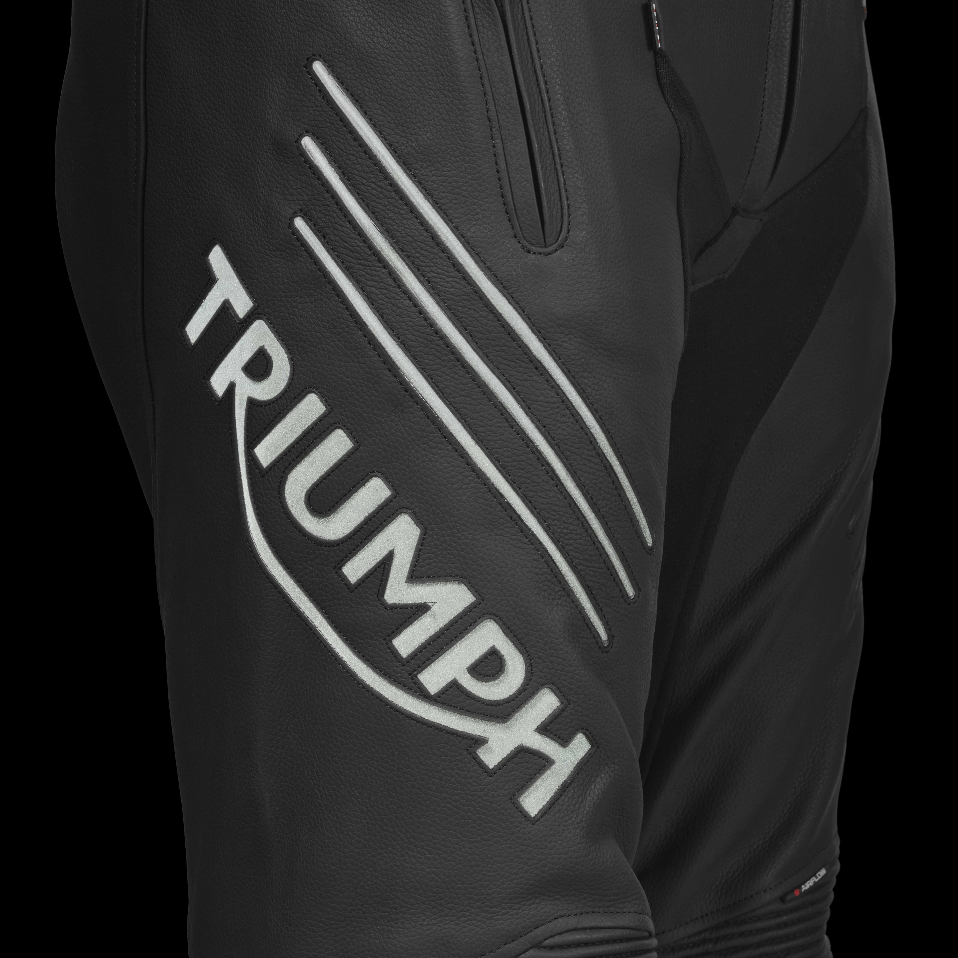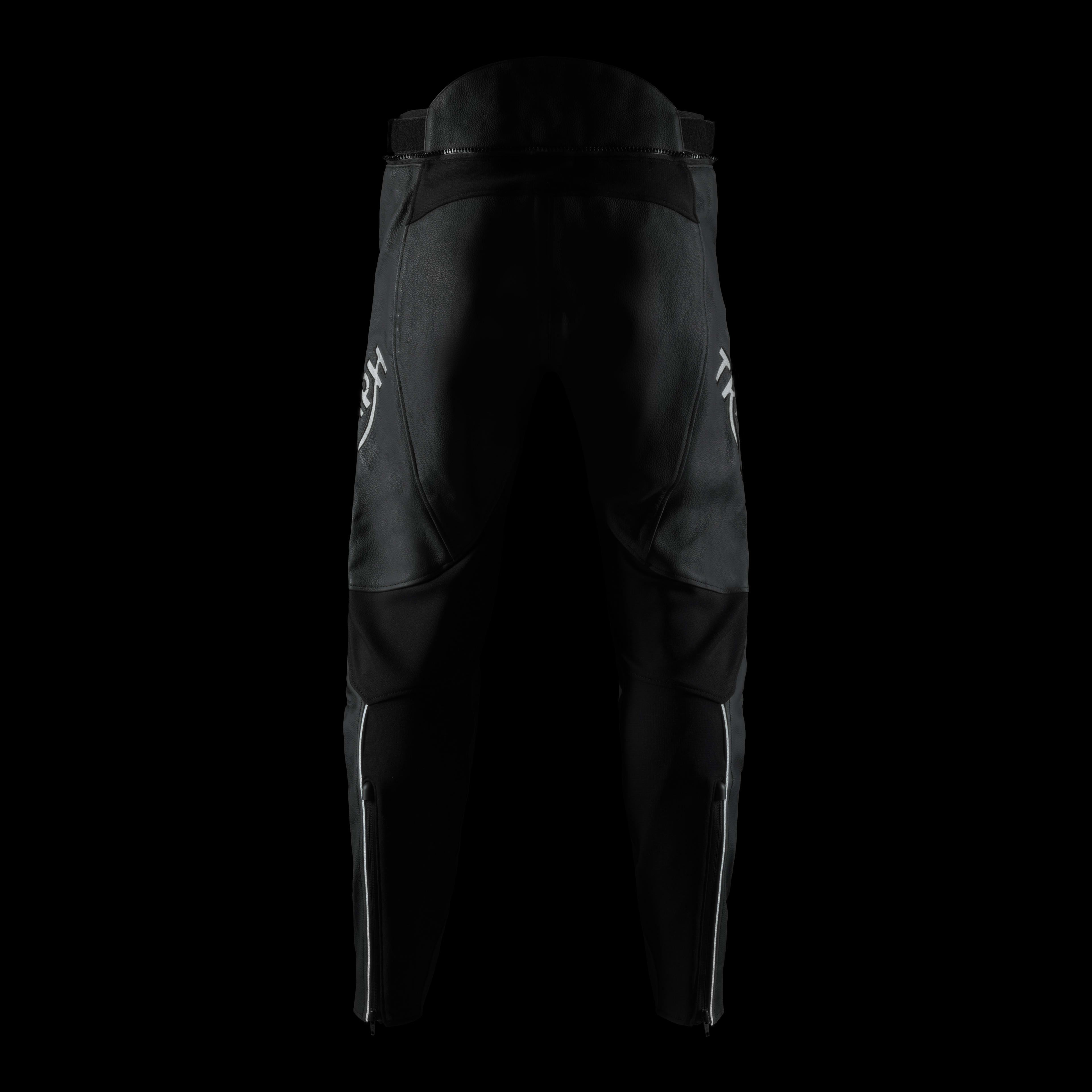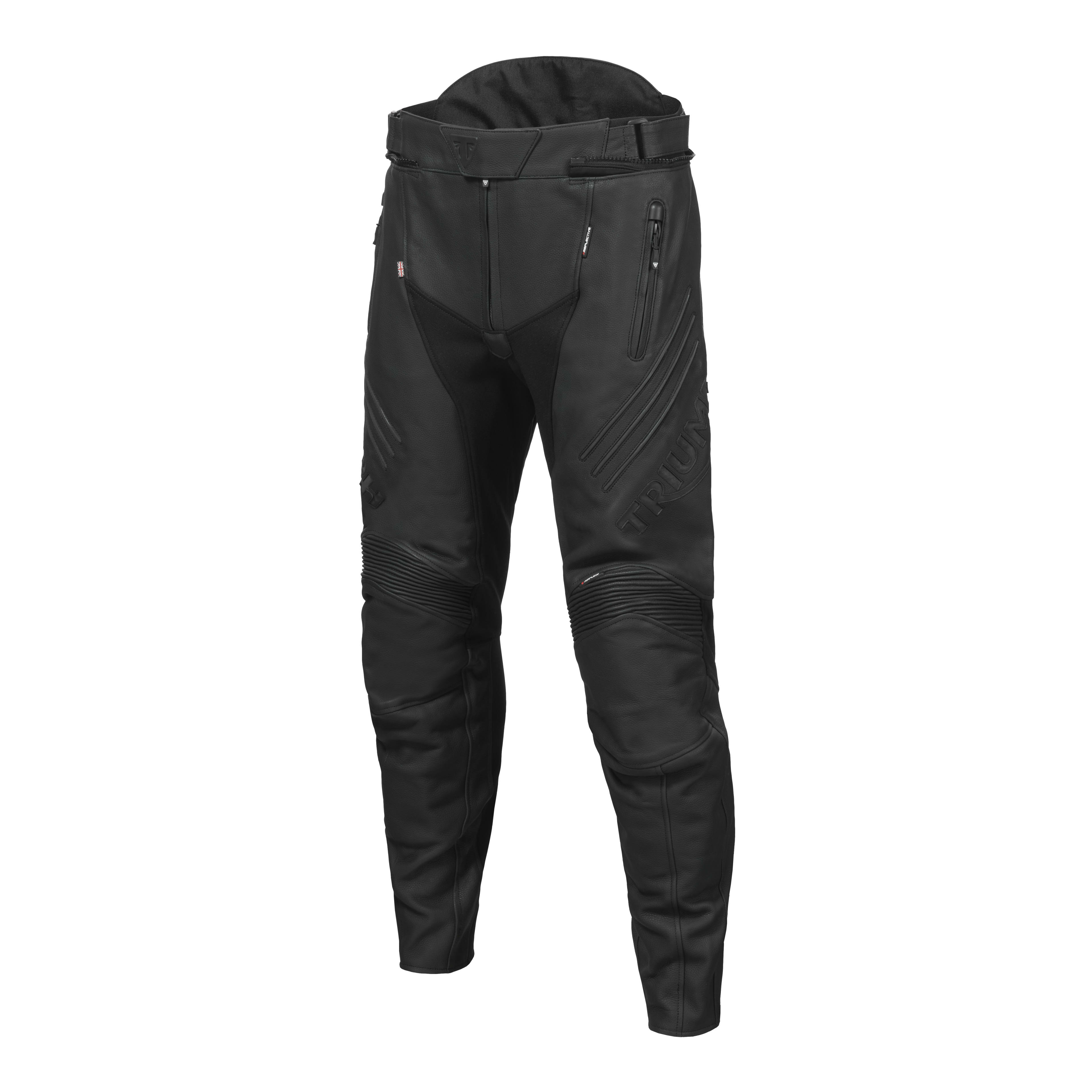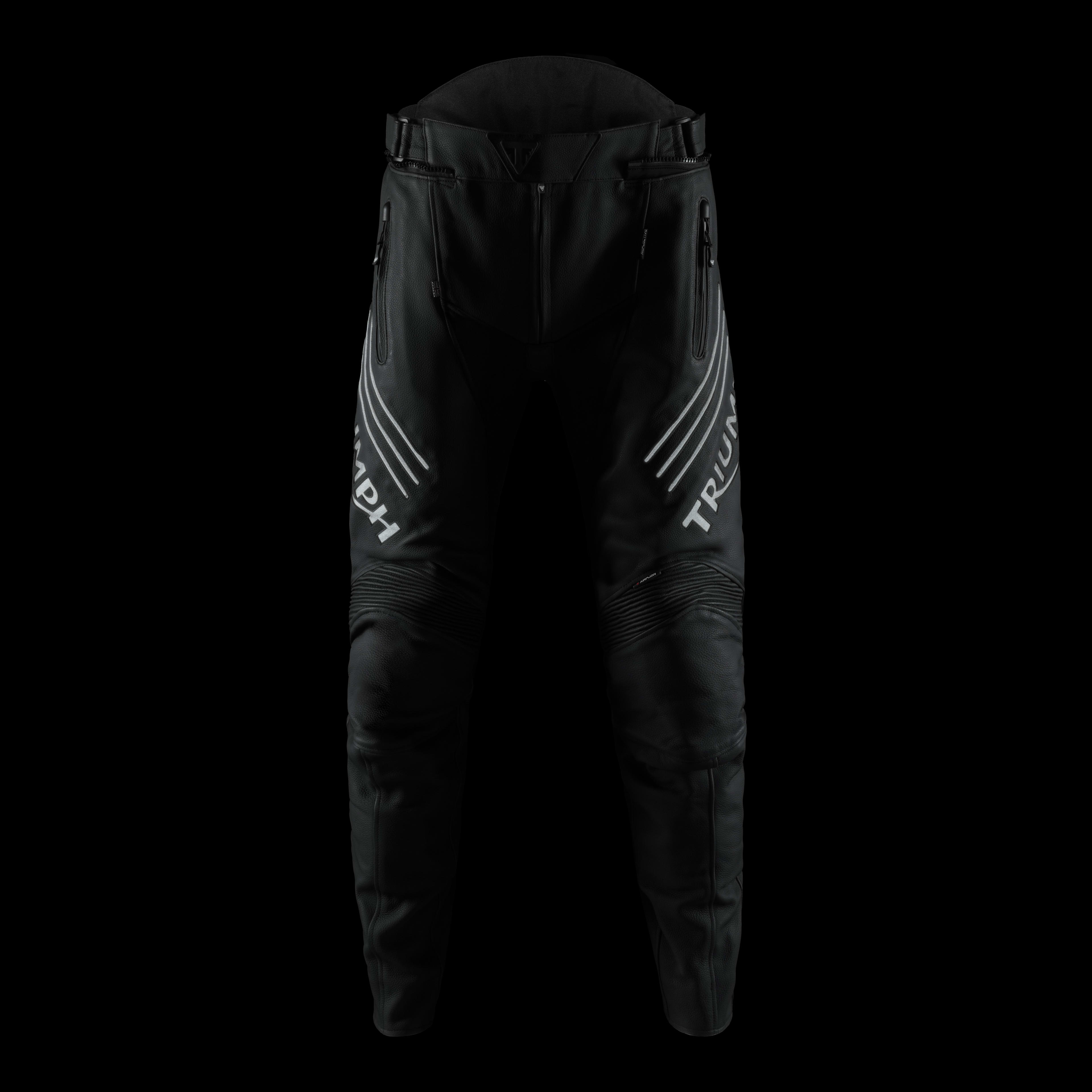 The Sabre Pant is an excellent all-round, road focused leather Roadster pant. Constructed from sports leather with a mesh liner to aid air circulation. The ergonomic shaping and large stretch panels reduce bulk and pinching at the crotch and knee, enhancing rider comfort. The Sabre Pant is styled to match the Sabre Jacket, but the subtle styling and dark reflective logos make these an excellent pairing to any Triumph Roadster jacket. The Sabre Pants feature removable D3O® extended knee protectors, and D3O® LP1 Hip Protectors.